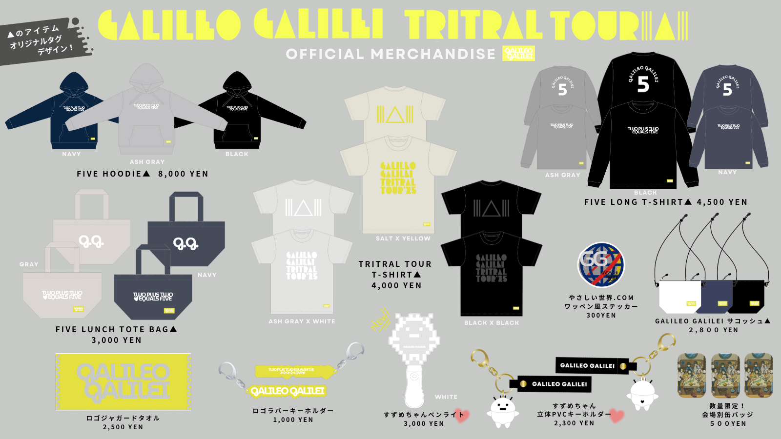 4/26 (土)12時〜5/6(火)23時59分オフィシャル1次先行URL:https://eplus.jp/galileogalilei/4月12日(土)12時〜4月23日(水)23時59分Galileo Galilei FC2次先行受付(抽選)3月29日(土) 12時〜4月6日(日)23時59分URL:https://www.galileogalilei.jp/feature/tritral2025Galileo Galilei FC最速先行受付(抽選)